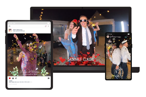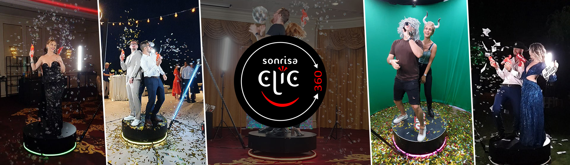 Sobre los vídeos resultantes en Sonrisaclic360 se puede añadir personalización gráfica según la temática del evento, tanto estáticas como dinámicas, es decir, elementos en movimiento. También se puede añadir música.